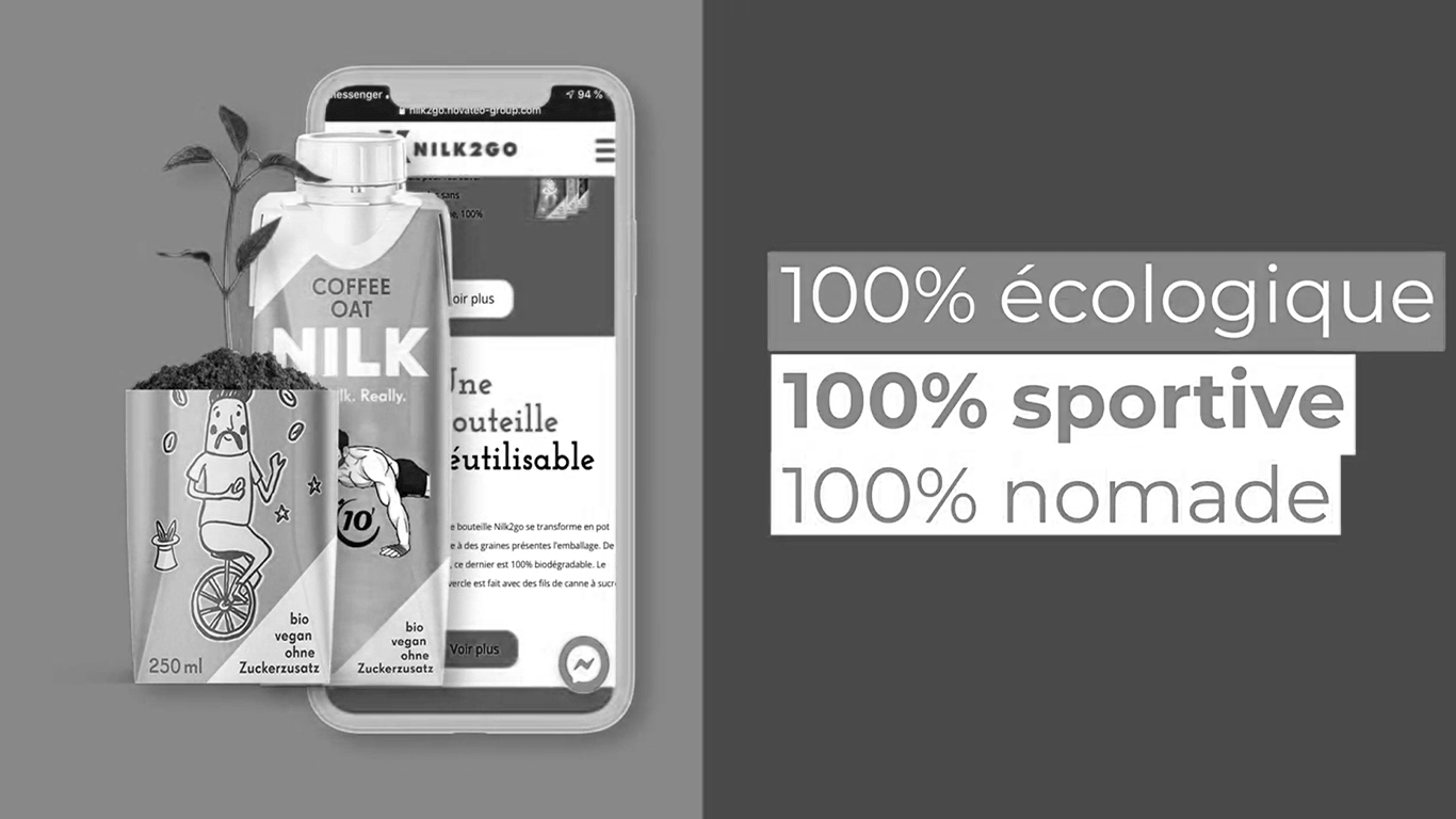 Ce projet est le résultat d'une semaine thématique à l'Université dans le but de créer une campagne publicitaire sur une marque déjà existante : NILK2GO. NILK2GO, est une gamme de produits venant de la marque MyMuesli qui est composée de différentes boissons végétales. En cinq jours, avec mon groupe composé de six personnes, nous devions réaliser le concept d'une campagne publicitaire pour cette marque afin de la présenter devant un jury qui était composé de responsables de la marque MyMuesli. Avec mon groupe, nous avons mis en avant la facilité de transport de la bouteille et le fait qu'elle soit une sorte de "couteau-suisse" en proposant différentes utilisations de la bouteille (une fois vidée) : séances de sport, graines à planter dans la bouteille, etc... Nous avons également développé un site internet pour la campagne qui est équipé d'un robot Messenger qui a la possibilité de répondre aux différentes interrogations des utilisateurs du site. Ce projet nous a permis de constater et de s'adapter à des demandes clients.